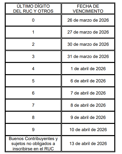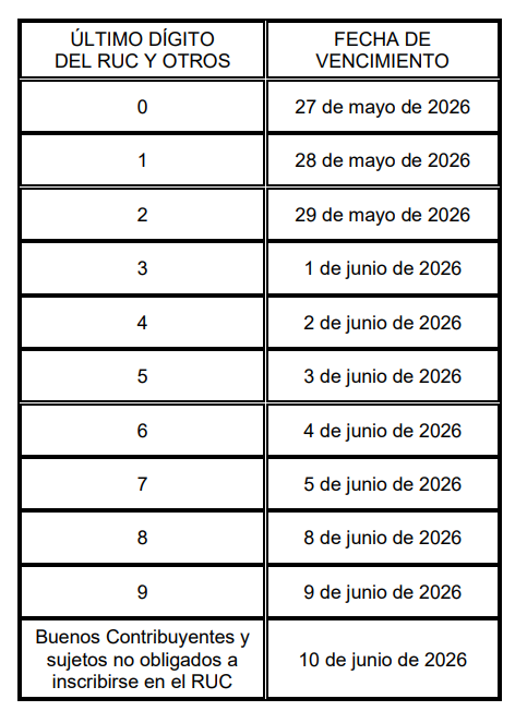 Este cronograma especial fija los vencimientos entre el 27 de mayo y el 10 de junio de 2026, en función del último dígito del RUC, comprendiendo también a los buenos contribuyentes y a los sujetos no obligados a inscribirse en el RUC. En consecuencia, el cumplimiento de estos plazos constituye la referencia legal válida para evaluar la oportunidad de la presentación de la declaración anual por parte de las MYPE.